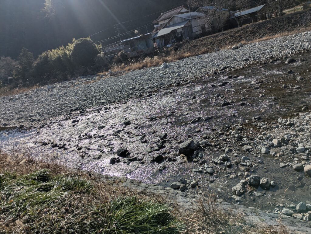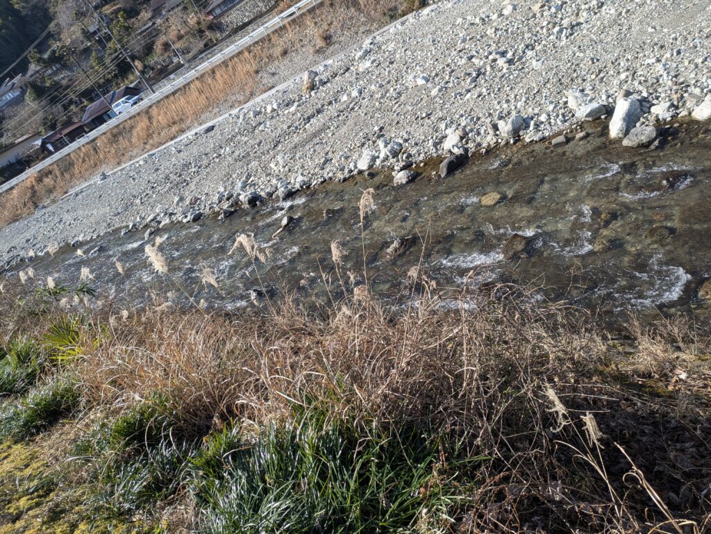 深澤島橋上駐車場の前のチャラ瀬。9m程の高さに電線有り、降り口は土手。