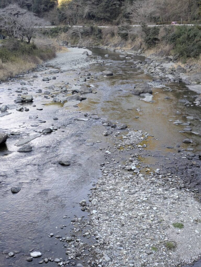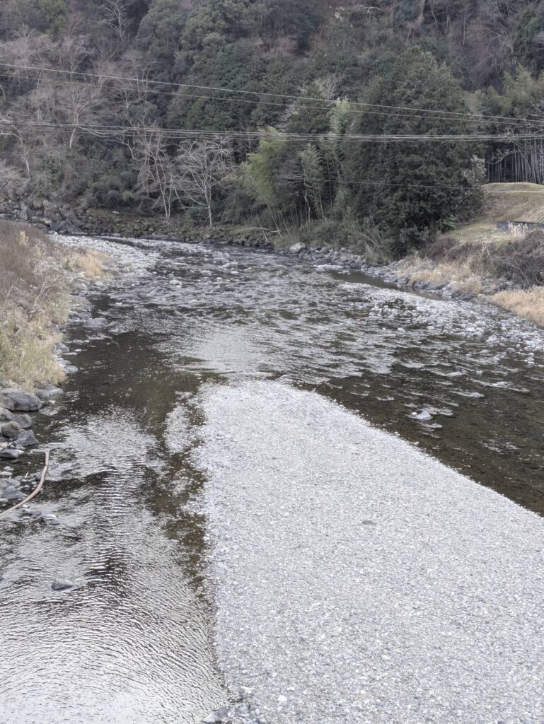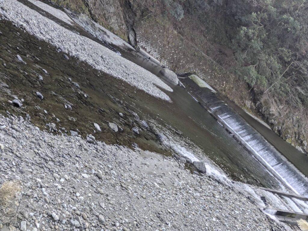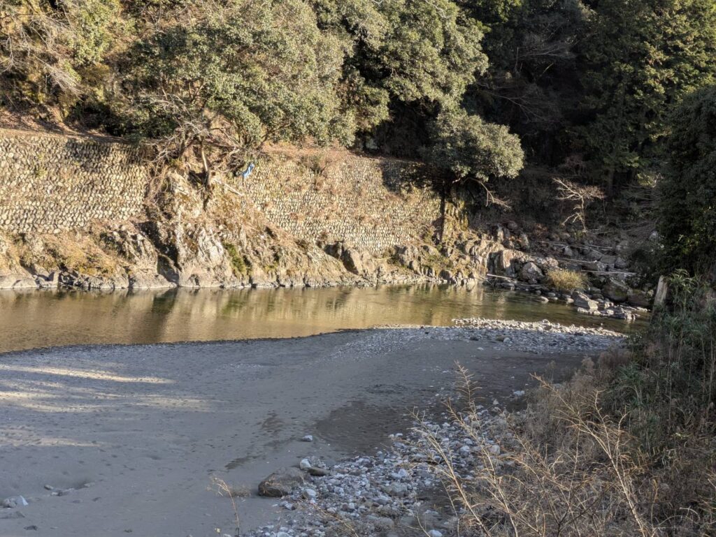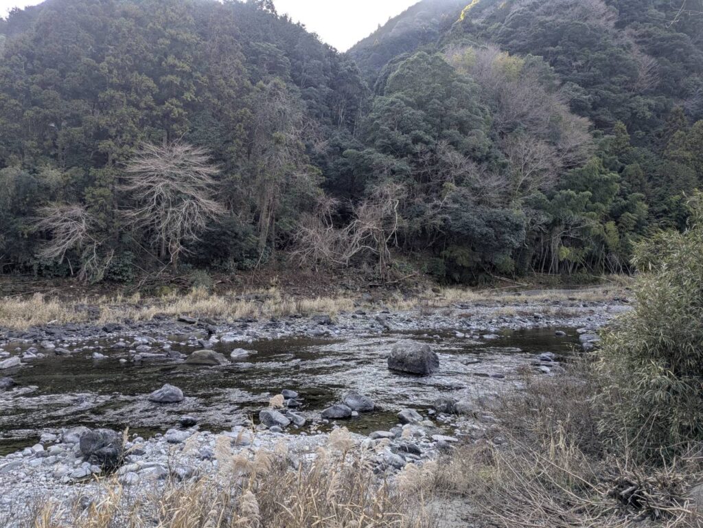 吊り橋は2022年の台風15号の被害により流失。大石が点在するチャラ瀬。