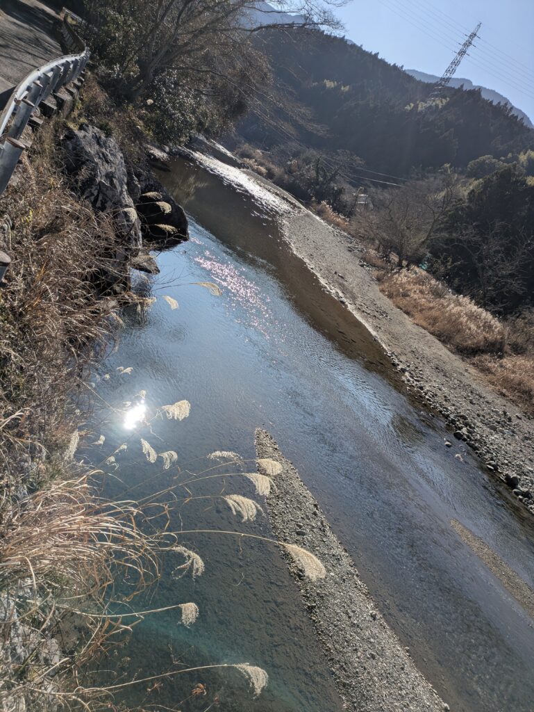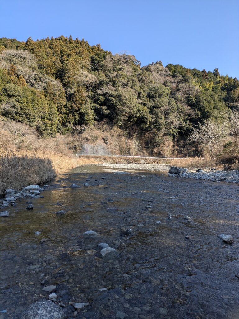チャラ瀬から瀬、淵へと続く。吊り橋は2022年の台風15号の被害により流失。左岸側の駐車可能スペースより土手を下って降りられる。