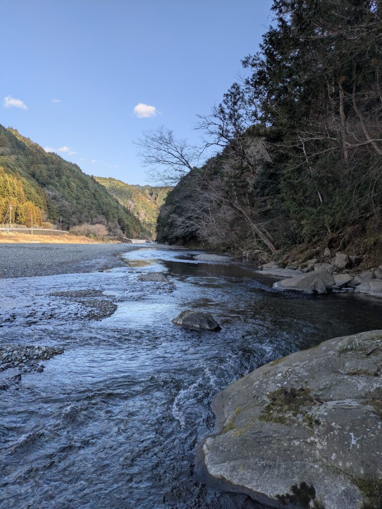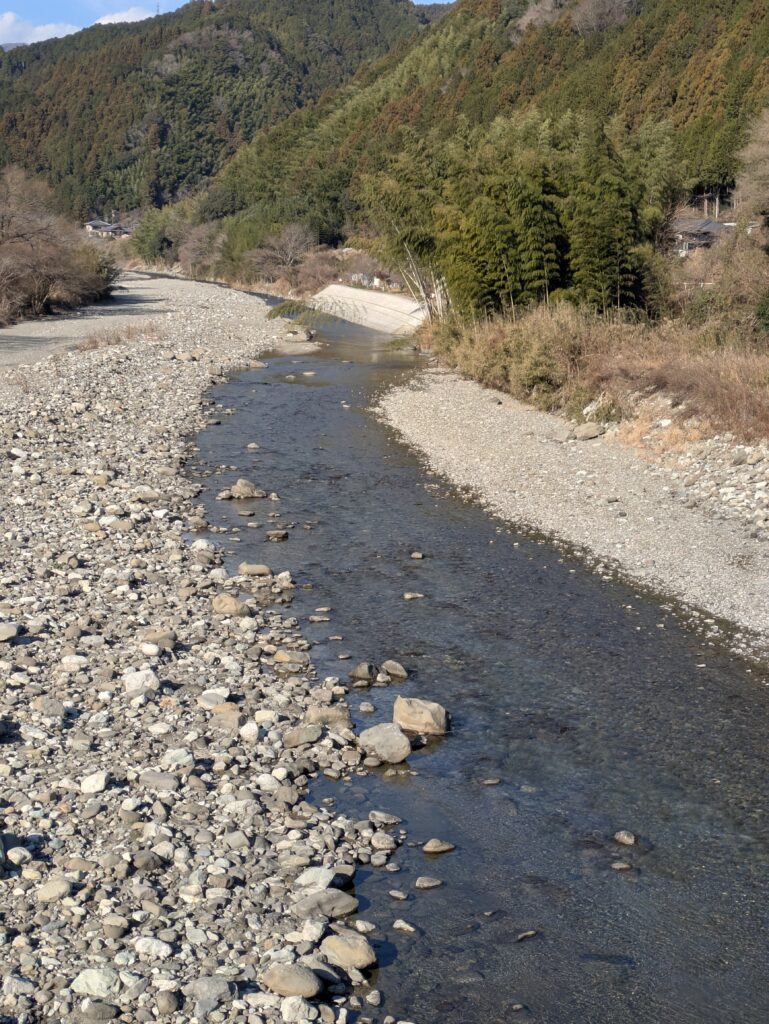 砂利底のチャラ瀬から瀬へと続く。川遊び・キャンプシーズン中は遊泳客多い。