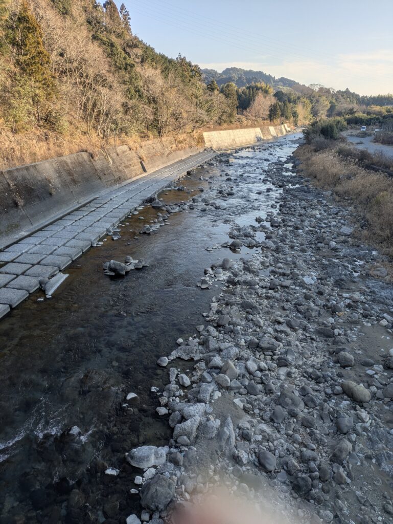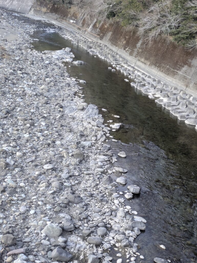 大石とテトラが点在するトロ場。降り口は但沼大橋右岸側の50m程上流の土手。